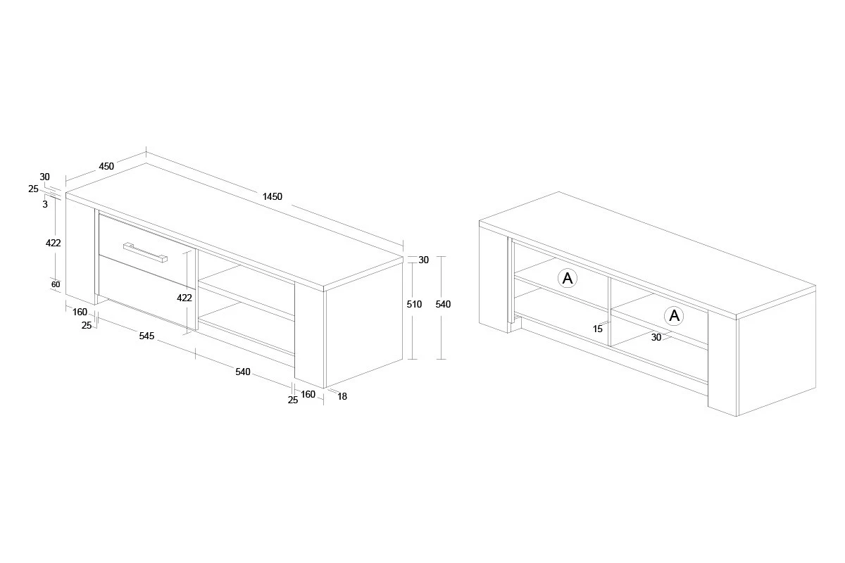 Dit TV meubel is gerealiseerd in decor imitatie hout en behoort tot de woonkamercollectie ELITE. Hij heeft 1 deur en 2 nissen.
