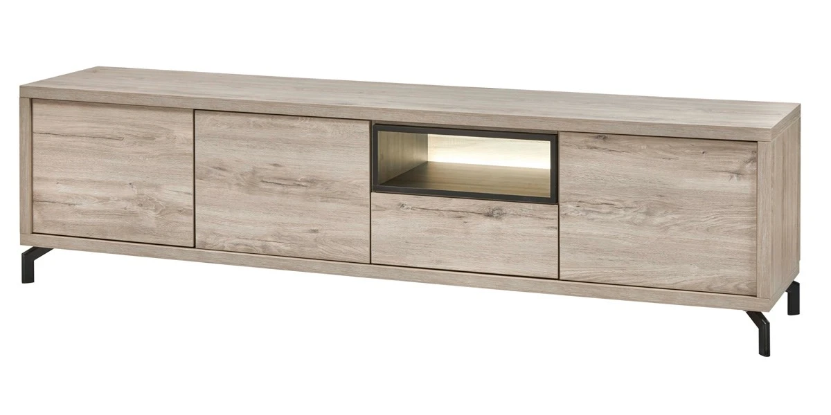 Praktische, ruim TV meubel of lowboard uit de collectie Kwadro. Deze prachtige woonkamer is gerealiseerd in melamine imitatie lichtgrijs eikenhout gecombineerd met zwart kleur. Voor de meubelen Kwadro heb je keuze uit 4 verschillende afwerkingen (antraciet, beton, wit en zwart). Bestaat in verschillende afmetingen. Combineer dit TV meubel met alle andere meubelen uit deze fantastische serie!