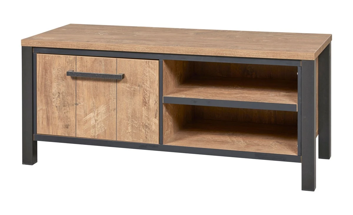 Prachtige TV meubel LOVINA met een natuurlijk karakter dankzij haar afwerking in melamine hout, gecombineerd met mat zwarte details en handgrepen. Het TV meubel heeft 1 deur en 2 nissen. De metalen poten zorgen voor een stijlvolle toets.