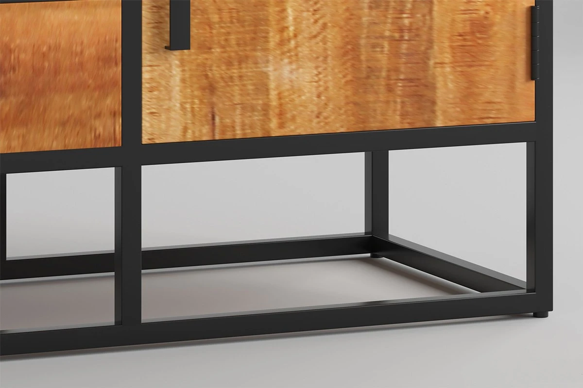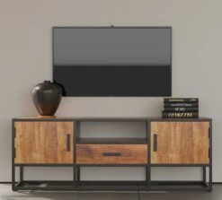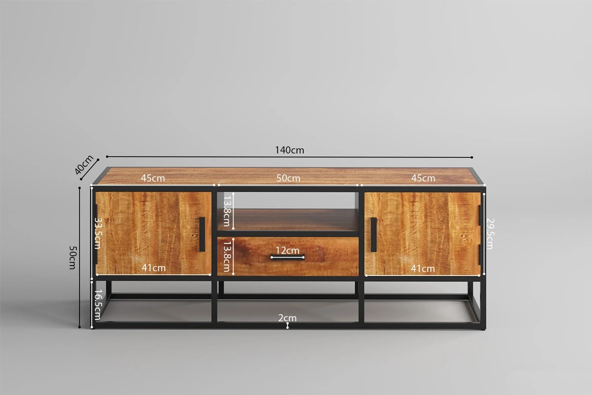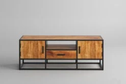 Het TV meubel MADEIRA met lengte 140cm heeft een stevige zwart metalen structuur en een blad van exotisch mangoliahout. Stijlvol en ook nog eens erg praktisch dankzij zijn 2 deuren, lade en open vak.