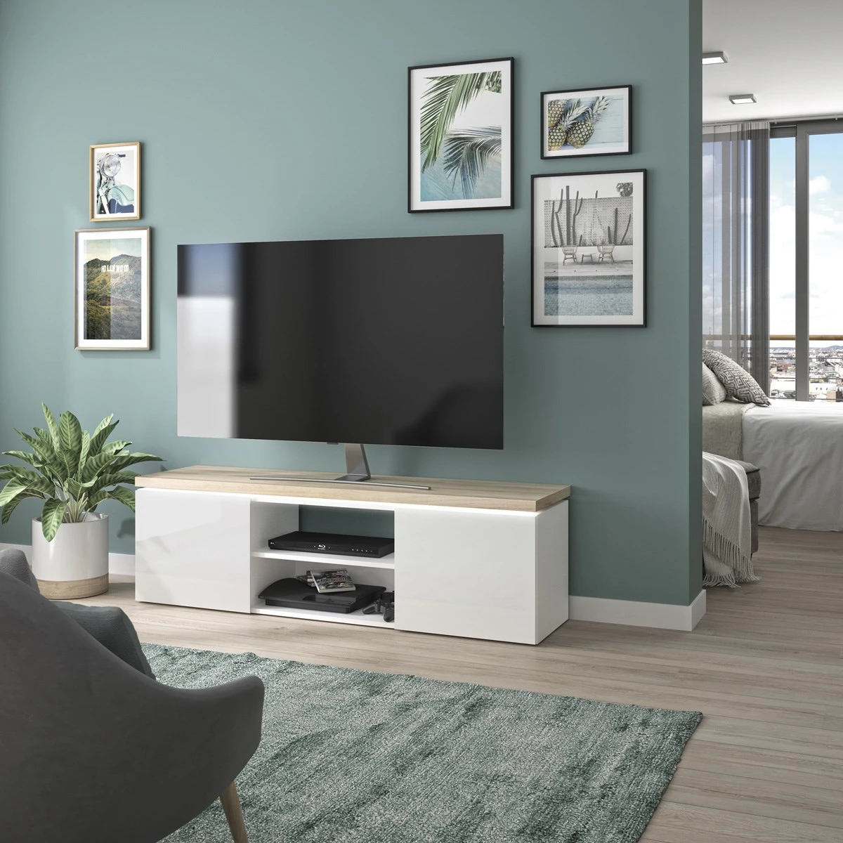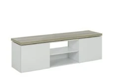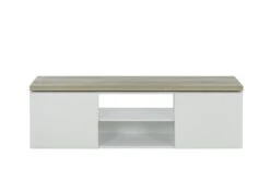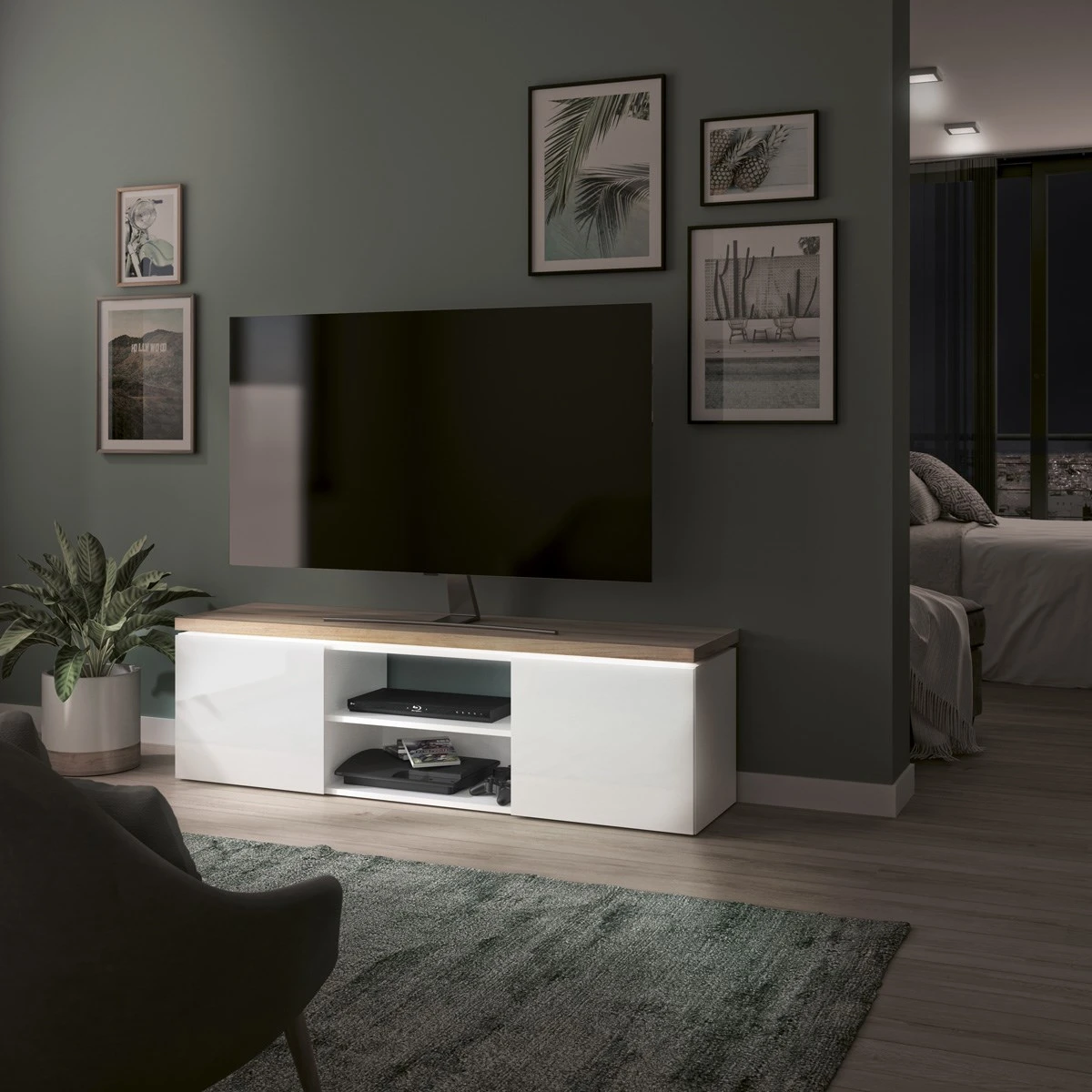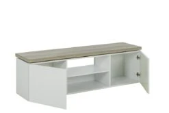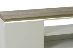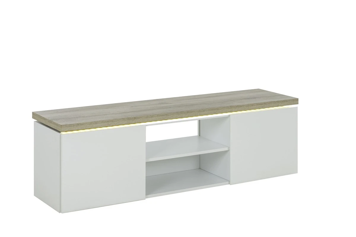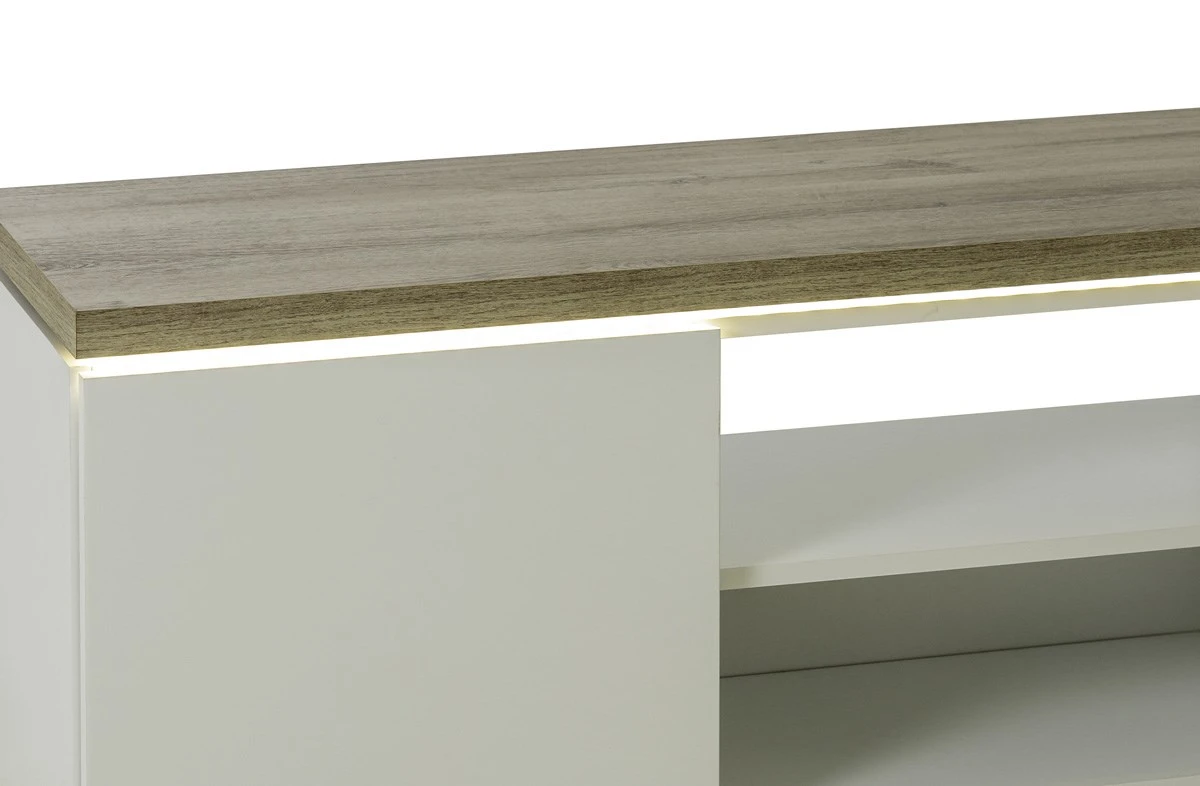 Het TV meubel MIKE is gerealiseerd in witte hoogglans die dit meubel een klassevolle en moderne stijl toekent. De LED-verlichting onder het blad zorgt voor een leuk retro effect, wat dan weer bijdraagt tot een geslaagde sfeer in de salon.