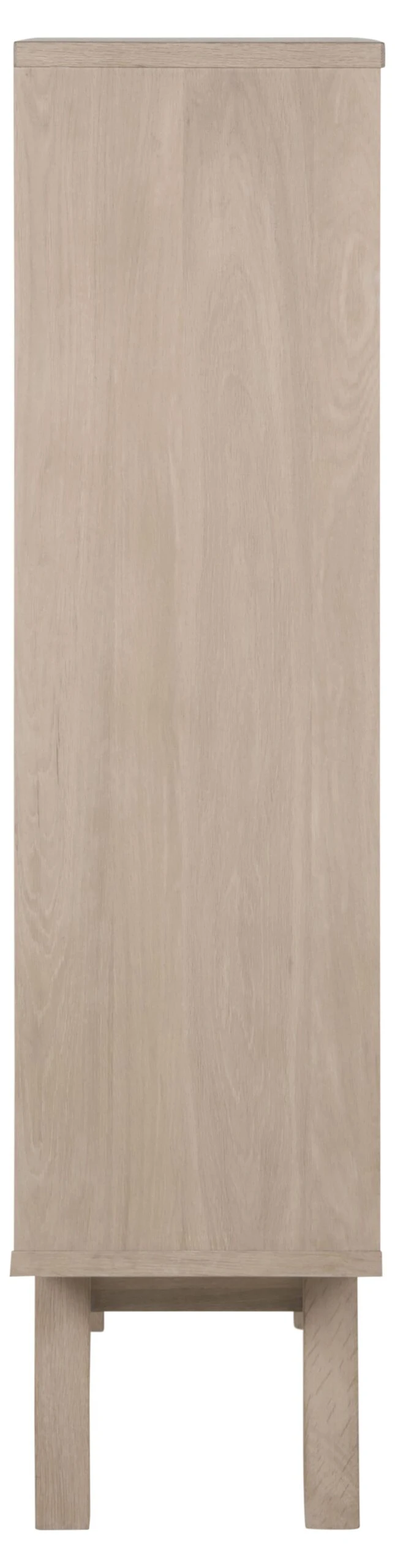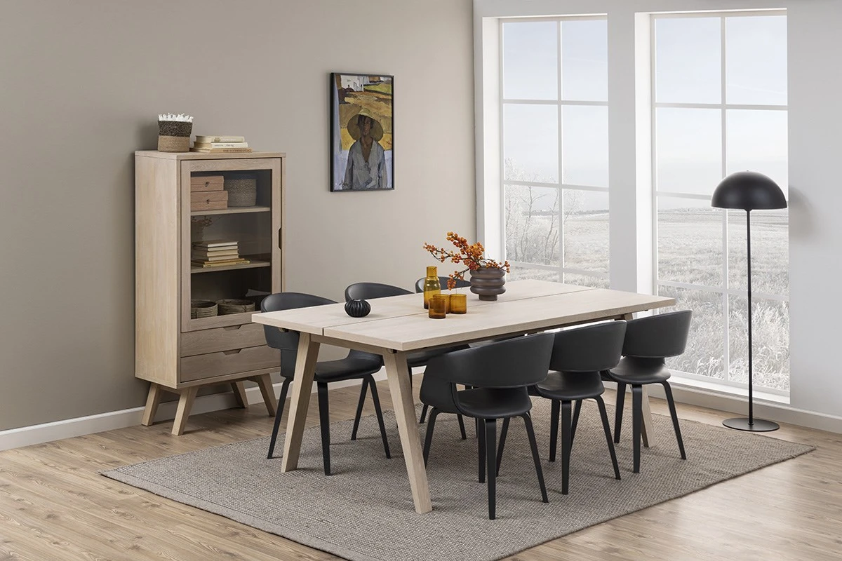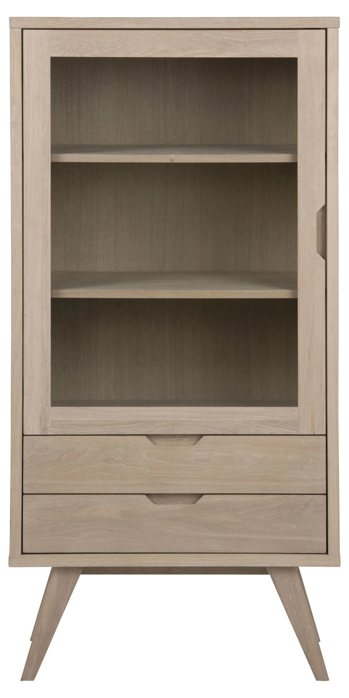Ontdek onze vitrinekast uit de A-Line collectie, die Scandinavische esthetiek combineert met eigentijds design. Uitgerust met 2 laden en 1 deur, heeft het een elegant wit gepigmenteerd geolied eiken fineer. De deur van gehard glas voegt een modern tintje toe, aangevuld met de eikenhouten basis.