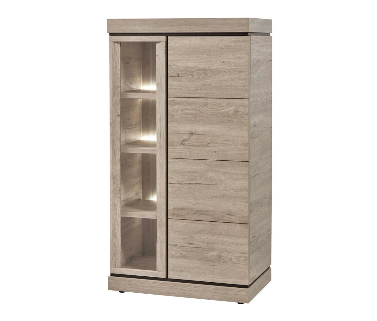 De vitrine met 2 deuren uit de stijlvolle, hedendaagse woonkamercollectie BELLUNO is gerealiseerd in melamine lichtgrijs eikenhout. Combineer deze vitrinekast met andere meubelen uit dezelfde serie.