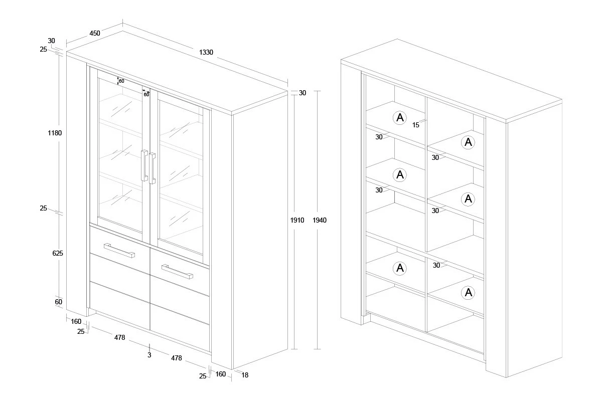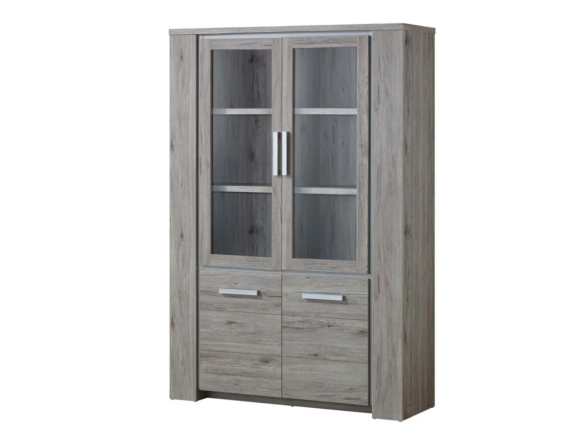 Deze vitrinekast is gerealiseerd in imitatie hout en behoort tot de woonkamercollectie ELITE.