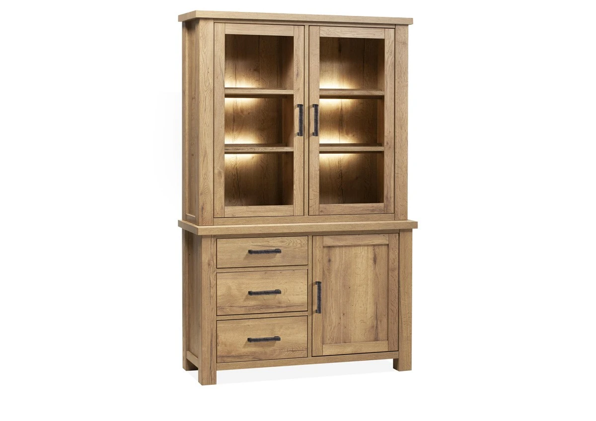 Prachtige vitrine met verlichting 126cm die behoort tot de woonkamer NEWCASTLE. De meubelen uit deze collectie zijn gerealiseerd in melamine halifax kleur Barley. Deuren en lades zijn voorzien van een softclose systeem. De vitrine is ook mogelijk zonder verlichting. Combineer de vitrine met andere meubelen uit dezelfde serie.