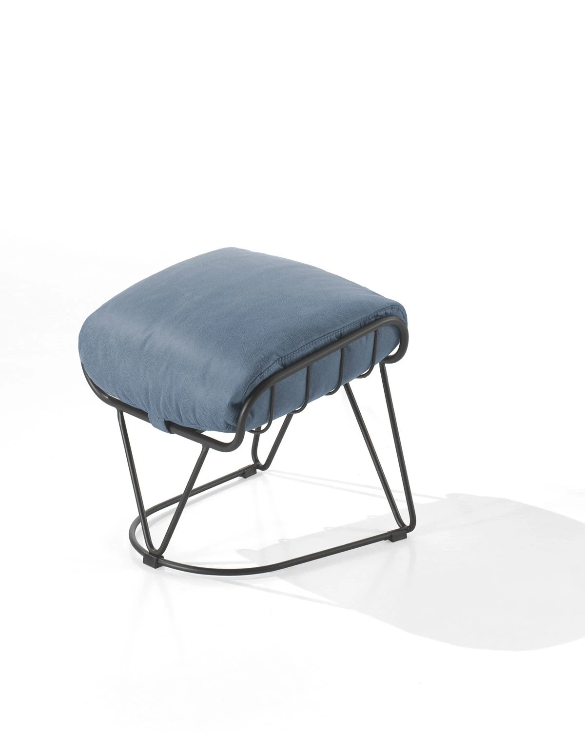 Mooie voetensteun van de SUMATRA collectie. De voetensteun, hier voorgesteld in blauwe stof is verkrijgbaar in verschillende kleuren en kan gecombineerd worden met de bijzetzetel uit dezelfde collectie.