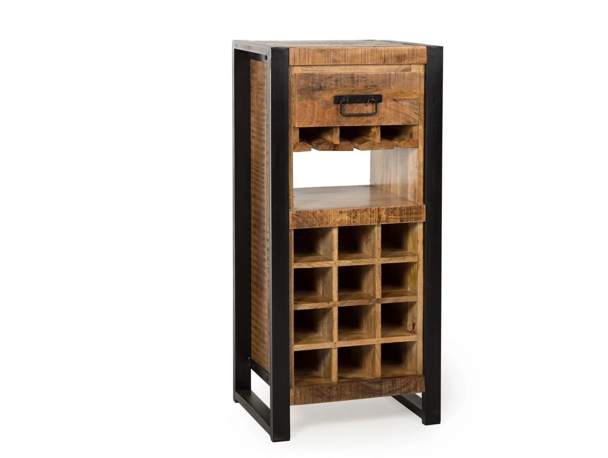 Dit stijlvolĀ wijnrekĀ behoort tot de woonkamer SOHOTO, een warmeĀ collectieĀ dankzij z’n veleĀ opbergmeubelenĀ gerealiseerd in duurzaamĀ massief mangohoutĀ met een metalen frame.Ā Het mangohoutĀ wordt gekenmerkt doorĀ een levendige en ruwe uitstraling. Het golvende oppervlak in combinatie met de geslepen lasnaden zorgen voor eenĀ industriĆ«leĀ look.