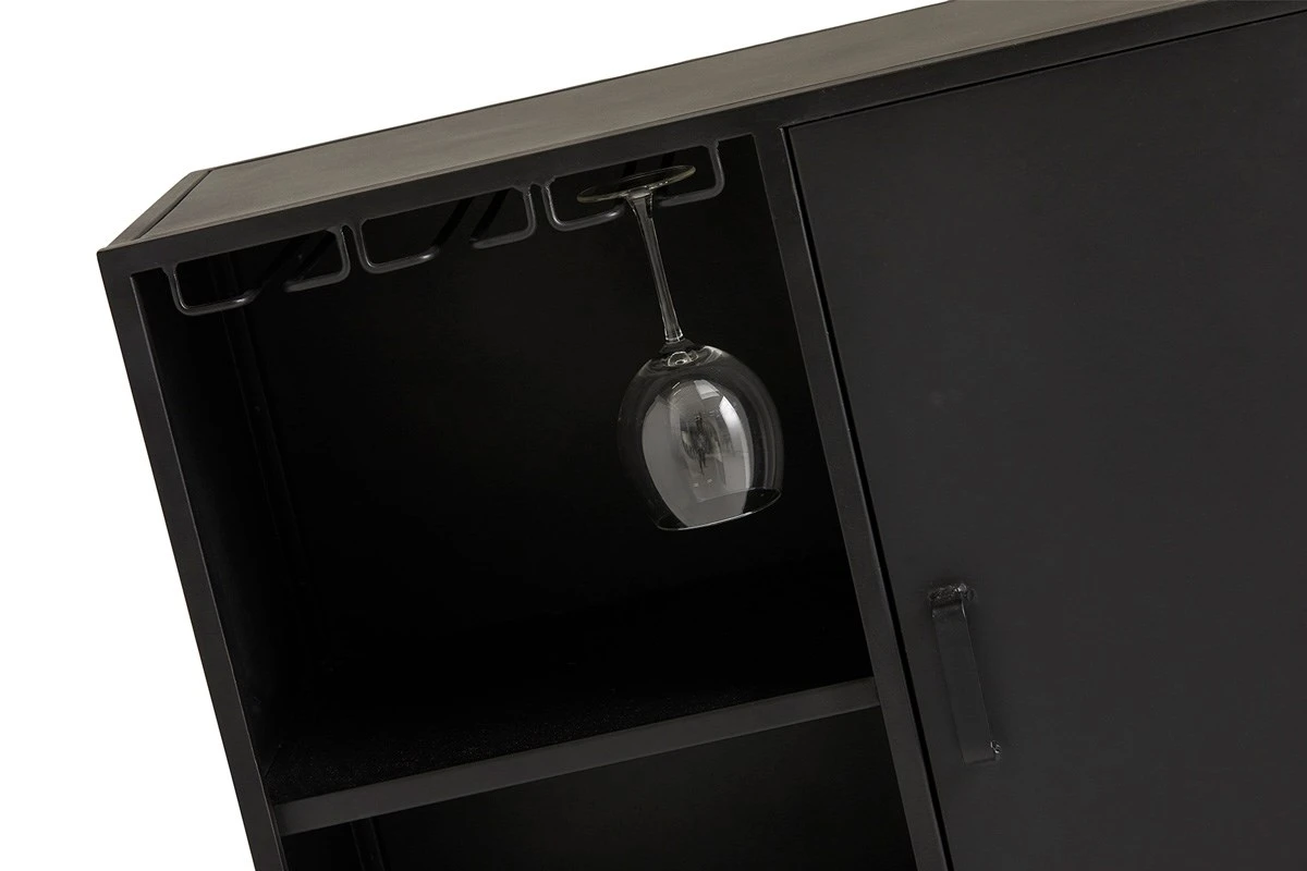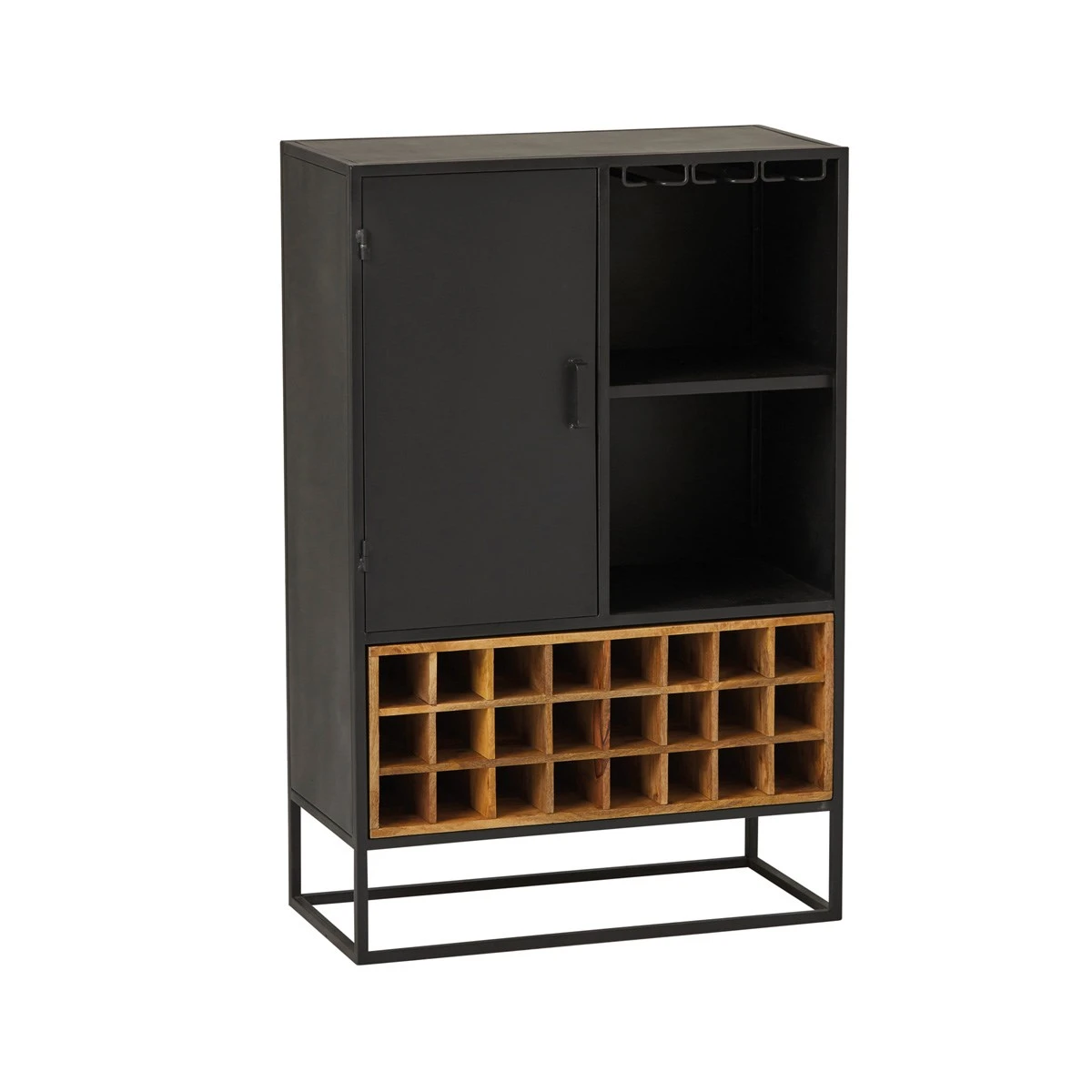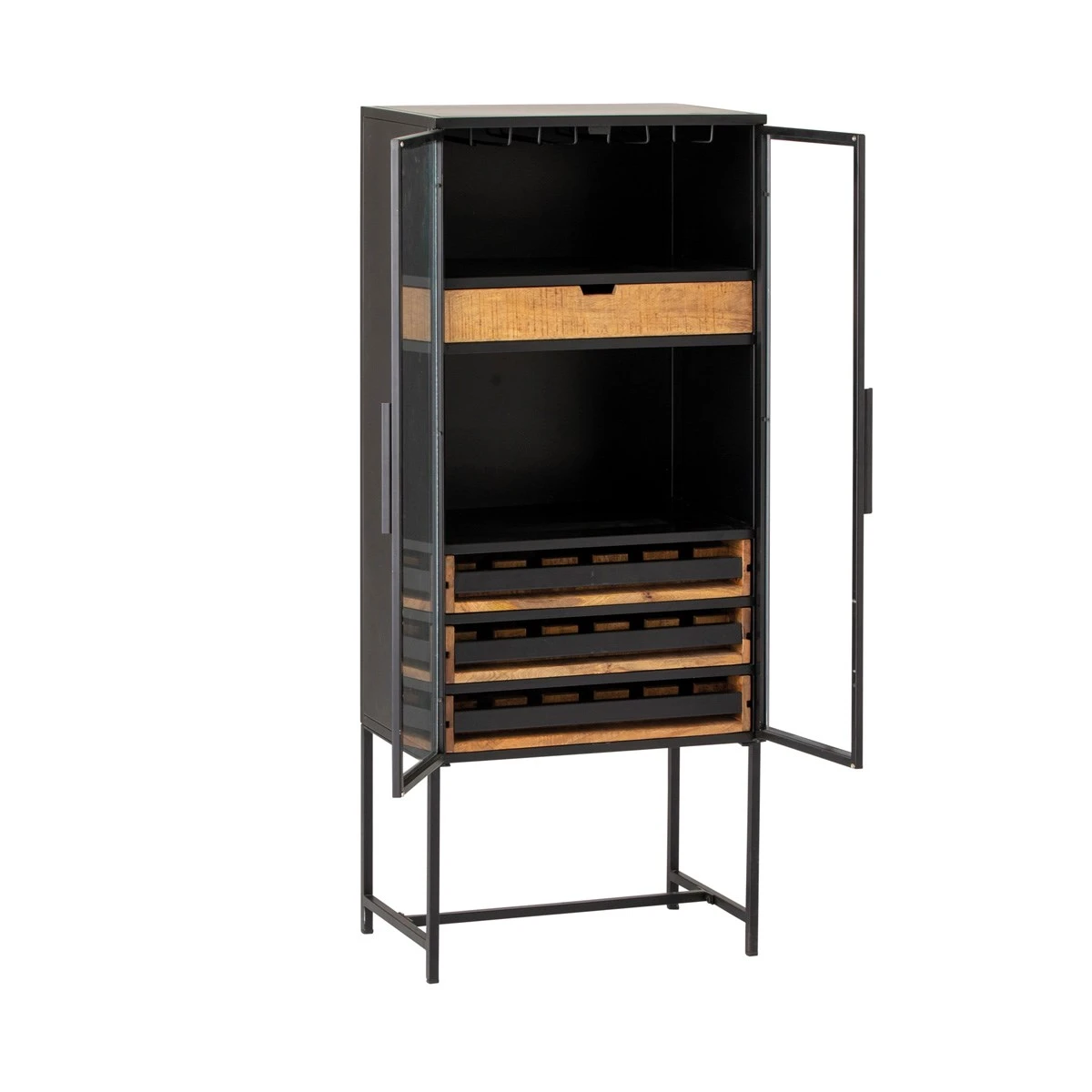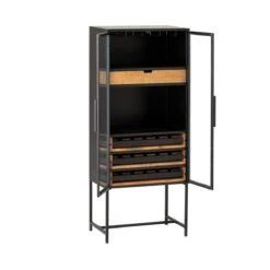 De ZEVIO wijnkast heeft onderin 3 lagen met vakken voor wijnflessen, daarboven 2 vakken en een deur. Bovenin is er ruimte om de wijnglazen in te hangen. ZEVIO is gerealiseerd in massief mangohout.