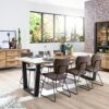 De woonkamer CUEDO heeft een industriële stijl met karakter. De lichte eikenkleur geeft een warme sfeer aan jouw kamer. De details en de metalen poten zijn aanwezig om contrast aan te brengen in het meubel. De deuren schuiven op wieltjes. LED-verlichting in de buffet en de vitrine is inbegrepen.