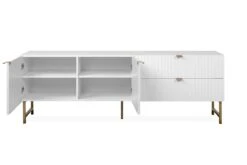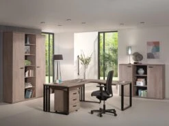 De woonkamer CUEDO heeft een industriële stijl met karakter. De lichte eikenkleur geeft een warme sfeer aan jouw kamer. De details en de metalen poten zijn aanwezig om contrast aan te brengen in het meubel. De deuren schuiven op wieltjes. LED-verlichting in de buffet en de vitrine is inbegrepen.