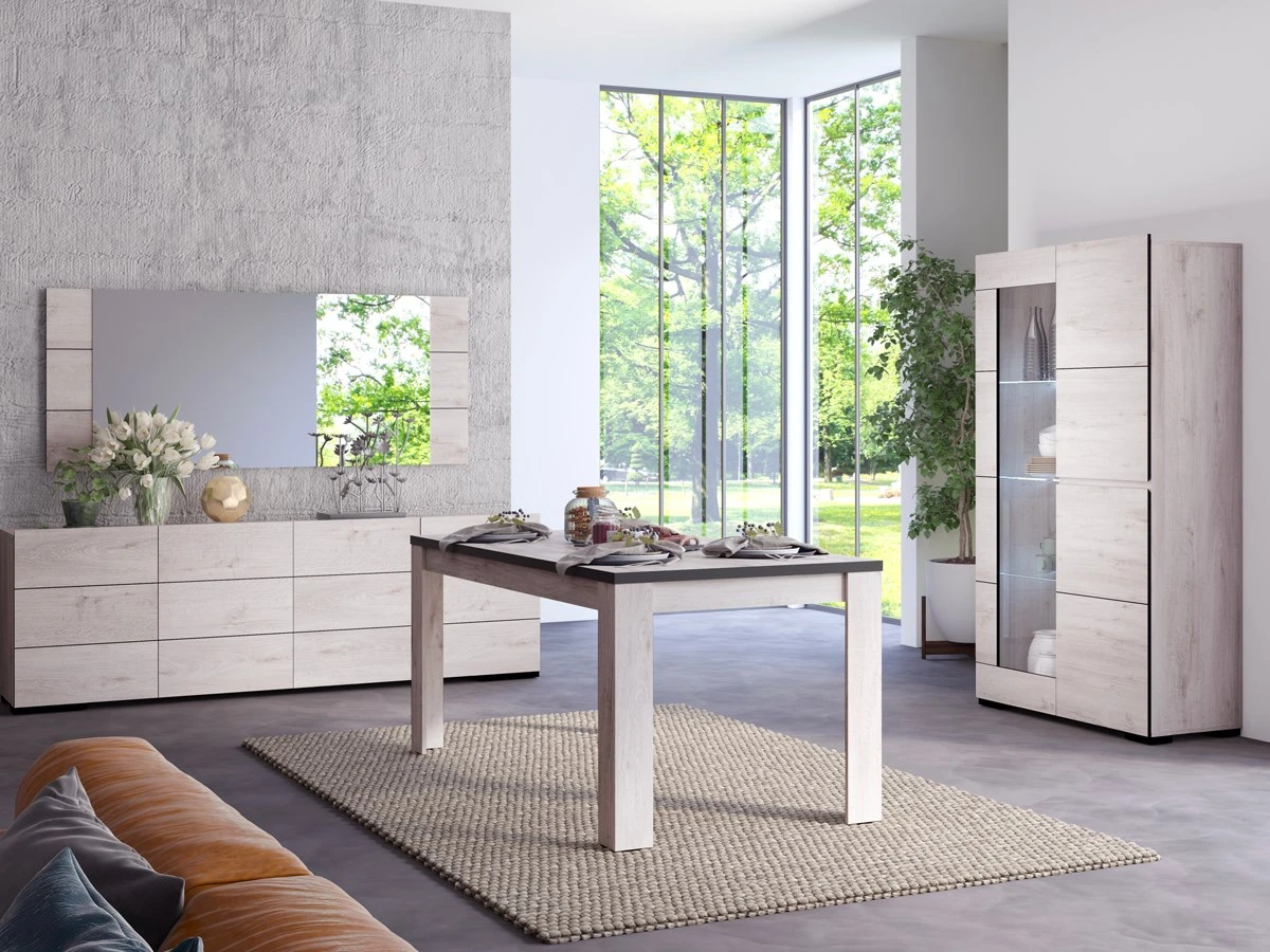 De woonkamer ELBA is gemaakt van spaanplaat in de kleur wit eiken. Ze brengt zachtheid in jouw kamer. De neutrale kleur van deze collectie past gemakkelijk bij jouw decoratie.