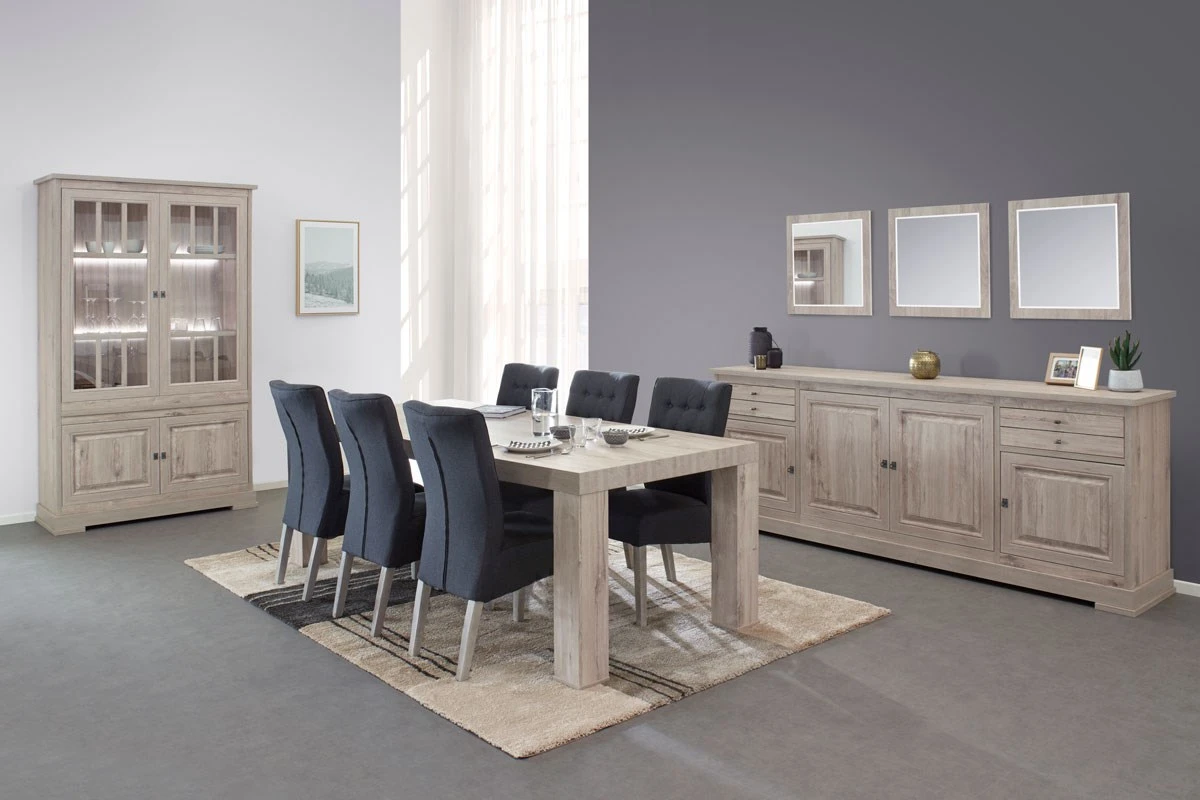 Mooie woonkamer KENT gerealiseerd in melamine imitatie hout. Deze collectie is perfect voor heerlijke maaltijden samen met familie en vrienden. Bovendien vult Kent de leefruimte met een warme sfeer. Dankzij de verlichting in de vitrine kan je decoratie en andere objecten op een mooie manier tentoonstellen.