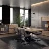 Prachtige woonkamer LUCA in melamine lichtgrijs eikenhout gecombineerd met zwarte accenten. Deze tijdloze collectie vrolijkt je interieur gegarandeerd op!